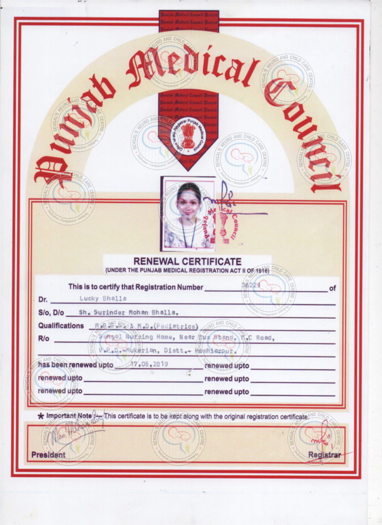 Dr. Mrs. Lucky Bhalla Sehgal is a renowned Pediatrician and Neonatologist of Amritsar. She did her MBBS from Manipal University in the year 2005. She was a distinction holder in MBBS. She persued her MD Pediatrics from Maharastra university of health sciences in the year 2007-2010. Later she did her Fellowship in Neonatology from Govt Medical College Sector 32 Chandigarh in the year 2011. She had successfully managed extremely premature infant as early as 23 weeks gestation (500 gms) and full term infants with a variety of medical and surgical illness. She was the topper in her MD and Fellowship Examination among all students in her college. She has participated enthusiastically in all social projects like the School Heath programmes, rural health camps, Government initiated programs like the pulse polio immunization campaign, Breast feeding awareness camps and the health checkup clinics for visually challenged children and children from broken homes.