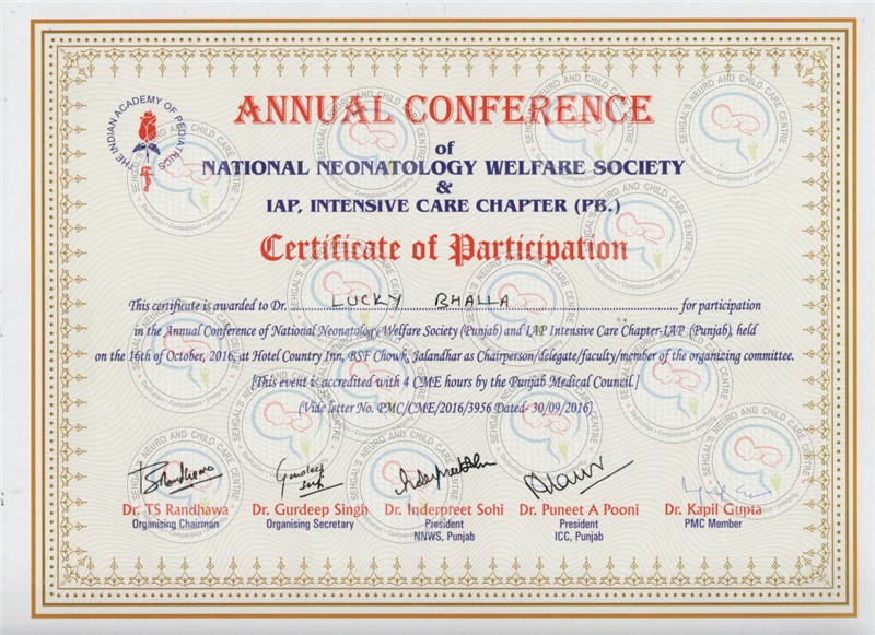 Dr Lucky was appointed as specialized medical officer in Sick Newborn Care Unit in year 2012-2013 in Civil Hospital Amritsar. Dr Lucky is presently working as a consultant Pediatrician in Fortis Escort hospital Amritsar since 2013. She has started the neonatal intensive Care Unit. She is well versed in doing neonatal resuscitation, intubation, high frequency ventilation, giving surfactant therapy, managing very low and extremely low weight birth babies, difficult venous access, inserting central venous and arterial catheters PICC, chest tube insertion, exchange transfusion, bedside EEG monitoring, therapeutic hypothermia etc. She is well trained in managing acute neonatal emergencies. She is trained in transportation of sick babies by road/ air ambulance. She has vast experience in the field of paediatrics. She has completed the training on SOS (Survival of Sickest) HOPE (Handling Office in Pediatric Emergencies)